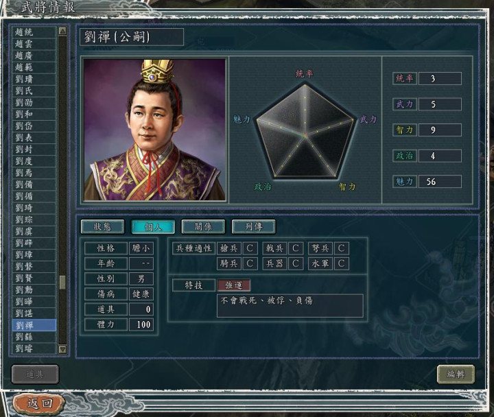 你没有看错,就是那位扶不起的阿斗后主刘禅,说是战五渣都是高抬,四维属性全是个位数。也许因为长坂坡七进七出身上连个皮都没破的原因,策划给了一个“强运”特技,想想也是,这运气确实逆天,就算亡国也能全身而退。