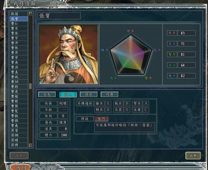 相比大哥张角,张宝在很多游戏中存在感较低,可能都赶不上张梁。在《三国志11》中张宝大放异彩,实力直接和张角拉平,成为整个游戏中唯二拥有原生级“鬼门”特技的武将。“鬼门”应该是游戏中T0级群杀技能,配合“百出”可以组出强力群杀队伍,随时左右战场天平的方向。