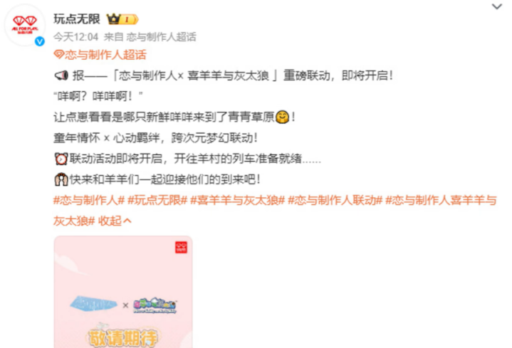啊?这对吗?你告诉我这怎么联动,谁抓羊,谁烧汤,谁的脑袋被锅敲?奥飞娱乐旗下玩点无限发帖确认乙游恋与制作人即将联动动画IP喜羊羊与灰太狼,目前尚未公布其他信息,喔我真得看看这怎么联动,太神奇了也。