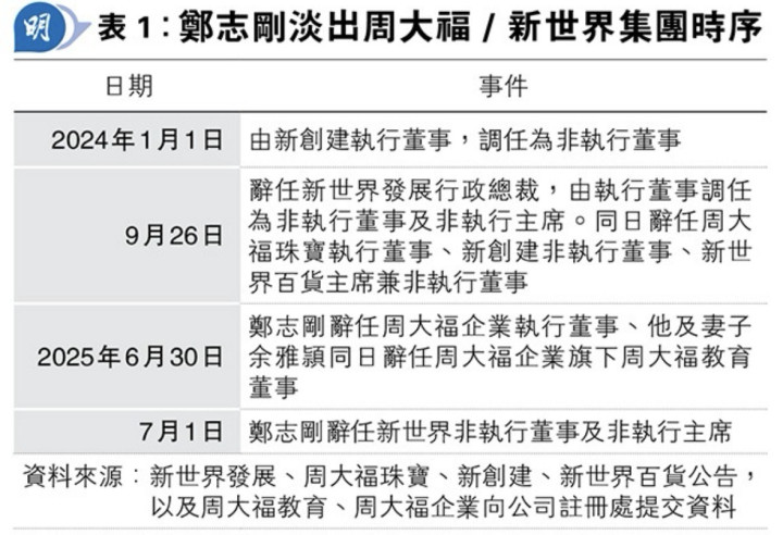 在郑志刚辞任了新世界CEO以及家族相关的重要职务后,在2024年11月又陆续辞掉了K11 Group、K11 Concepts的董事。在2025年7月前又辞任了新世界发展非执董及非执行副主席的职位,当时媒体还进行的大篇幅的报道,宣称郑志刚已经完全退出了新世界。事实上,还不止如此,原来在他辞任新世界发展非执董的前一日,还辞掉了新世界的控股股东,郑氏家族投资旗舰周大福企业董事一职。此外,在6月30日,郑志刚还与太太郑余雅颖一同辞去周大福教育董事一职,至此郑志刚与太太在郑裕彤家族的企业的上市公中再无任何职衔,只在一些非上市公司,比如周大福艺术基金等这些无关痛痒的公司担任董事。