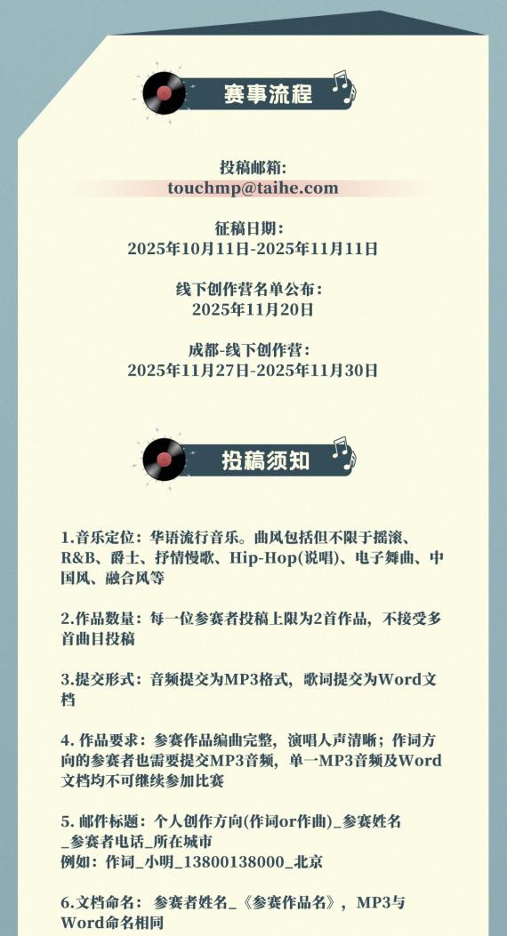 第二届“石破天惊华流词曲创作大赛”征稿日期为2025年10月11日至11月11日,参赛者可通过官方投稿邮箱touchmp@taihe.com提交作品。2025年11月20日,将公布第一轮20强选手入围名单。随后第二轮将由两位评审老师从20强入围名单中进行筛选,并确定最终的入围选手。最终入围的优秀选手将获邀前往参加于2025年11月27日至30日举行的成都线下创作营,两位评审老师也将全程参与,给予最细致的创作指导。最终的冠亚季军由选手投稿作品及线下创作营创作能力的表现,由两位评审老师综合评出本次大赛的冠亚季军。