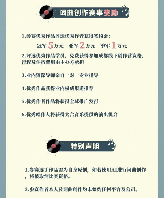 签约机会及签约金;免费参与成都线下创作营的资格(主办方承担行程及住宿费用);获得业内资深导师一对一专业指导;作品获得业内权威渠道推荐,并有机会全球推广发行;表现优异的唱作人更可获得演出机会。
