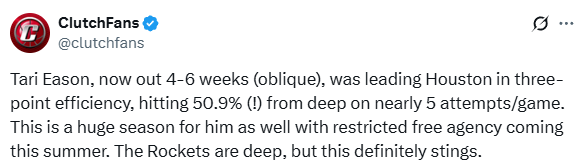 目前火箭8胜3负暂时排在西部第三位,高歌猛进喜提三连胜,但球队已有多名伤员——伊森腹斜肌拉伤至少休战4-6周;芬尼-史密斯仍在康复中,暂无具体的回归时间表;范弗利特则是遭遇十字韧带撕裂的大伤,提前赛季报销。